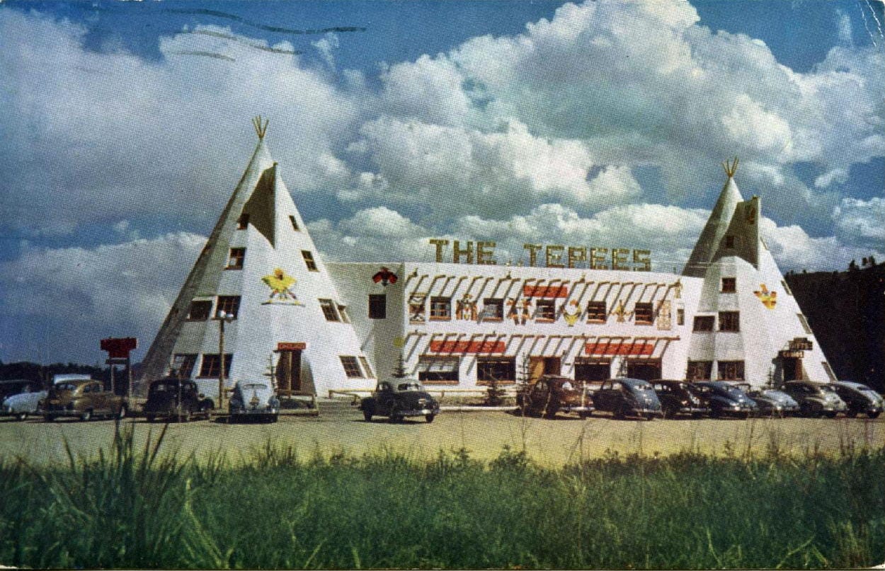 This is a bit beyond my usual territory, but I’ve always been interested in the El Rancho restaurant, just off I-70 (map). I was also intrigued by “The TeePees.” I didn’t know where they were, but I kept coming across postcards showing them. The old postcards identified both as being in Golden, Colorado. I recently learned that the two businesses were right across the road from each other.