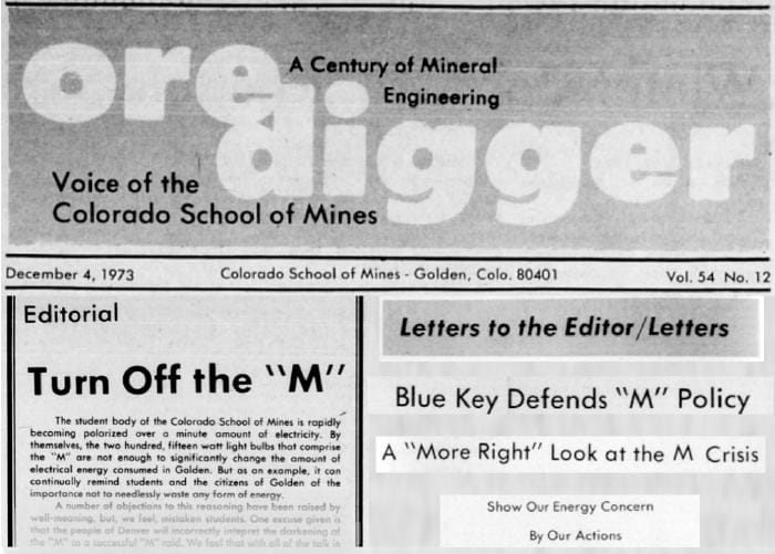 In 1973, the United States was in the midst of the Energy Crisis–a sudden shortage of petroleum products brought about by OPEC’s decision to cut oil production. Americans everywhere were discussing how (and whether) to cut energy consumption. In Golden, much of this discussion focused on the School of Mines’ “M”-blem.