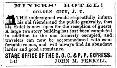 Their wives’ parents were John and Jeanette Ferrell, who in 1859 relocated to early Golden, where they opened and operated Golden’s first hotel, the one-story Miners Hotel, at now Washington and 11th Street where Clear Creek Commons now stands.