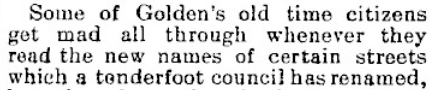 At the time, those streets were just lines on the map but that would change. We know these three streets today as the principal streets on the Mines Campus – Illinois, Maple and Elm Streets. So, when and why did these streets named after Golden pioneer women get renamed? It would never happen today. But it happened in 1904 with “Indignation being manifested among the old timers at the changing of names of certain streets in the city . . . having been originally named for . . . the earliest and most highly esteemed pioneer ladies of the town.” (Transcript, 3/9 and 6/29/1905).