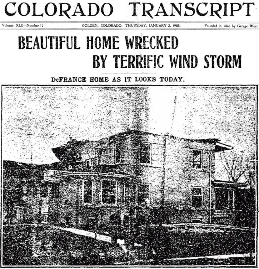 The January 2, 1908 Colorado Transcript featured this photo of the DeFrance home, which was located at 16th and Illinois. The home was less than a year old when the roof was roof was blown off in a windstorm.