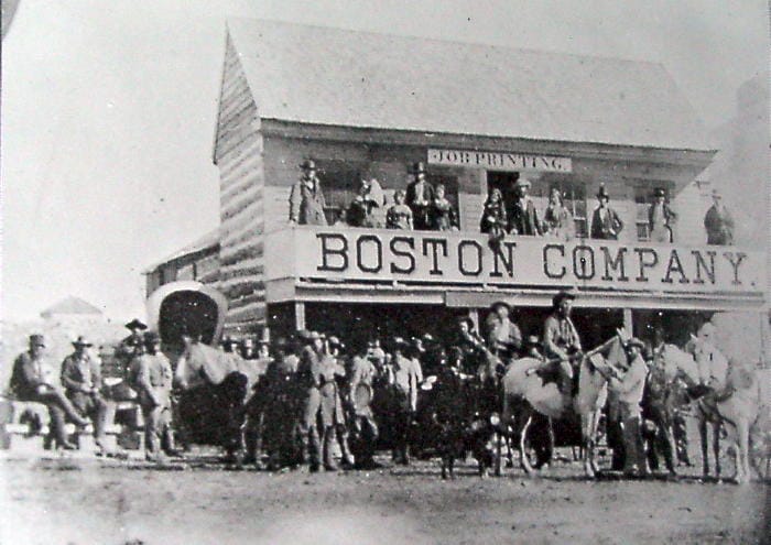 Our immediate company, known as the Boston company, which made the journey together, comprising seven members who had left the “Hub” late in March, crossed the Missouri at St. Joe on April 1st… Upon our arrival here there were perhaps half a dozen small outfits encamped along the banks of the creek, some of them already preparing to push farther on into the mountains, packing their belongings upon ponies, and even upon the backs of their oxen, as at that time no roads had been opened into or through their rugged fastnesses. This circumstance struck us at once as evidence that if the mines which had at that time been discovered should amount to anything, this as a location for transfer of goods, would be just the place for a town.