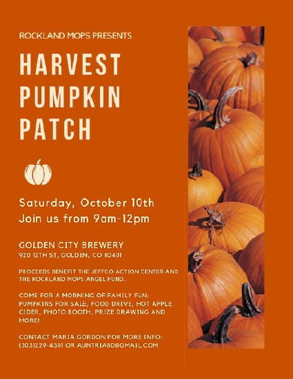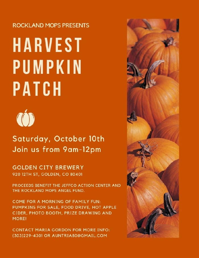 Who doesn’t love a pumpkin patch in the city? Join us for a morning of family fun! Come pick out pumpkins for the whole family. In addition to pumpkins galore, enjoy hot apple cider, a festive photo booth, a prize drawing and pumpkin decorating kits. All proceeds will benefit the Jeffco Action Center and the Rockland MOPS’ Angel Fund. Bring non-perishable items and canned goods for a food drive to support our local community!