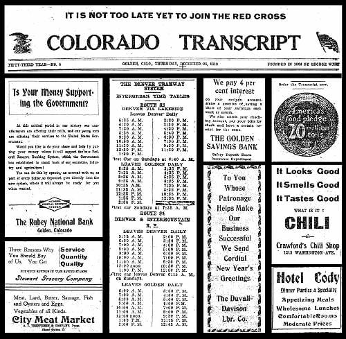 The Transcript was also able to report that the city water system was in fine condition. For several years, Golden had been plagued with water shortages caused by empty reservoirs and frozen pipes. Several improvements had been undertaken the previous year. The reservoirs had been enlarged and some of the pipe had been buried below the frost line. On this date in 1918, Golden’s reservoirs were full to overflowing and the pipes were running freely.