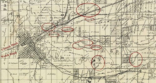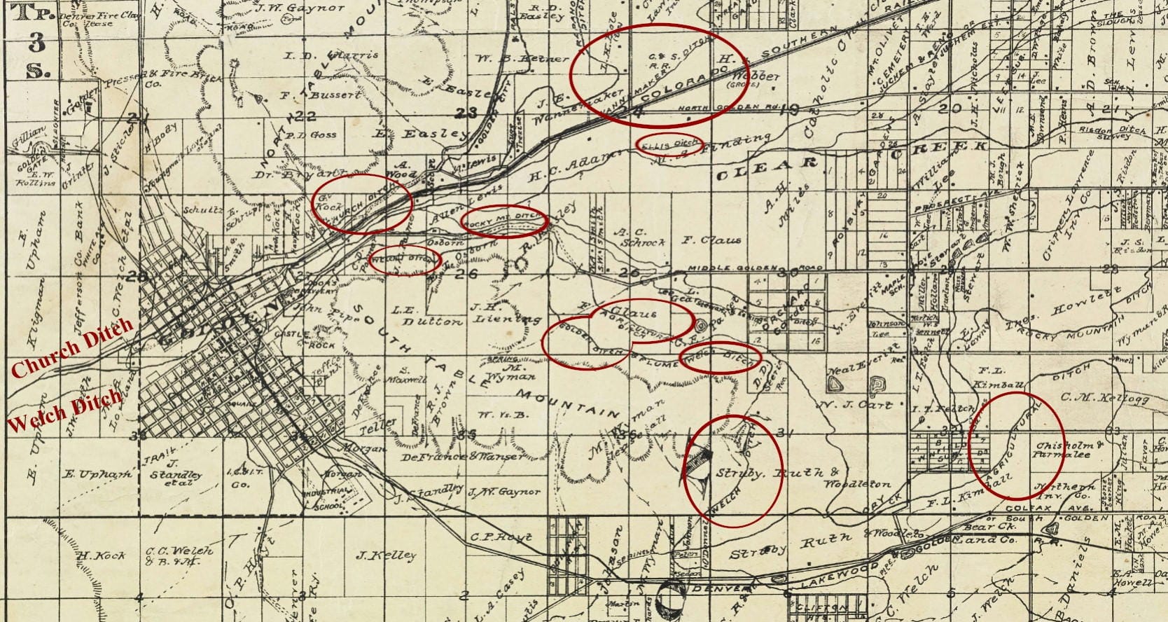 Irrigation canals or “ditches” were essential to early Golden, nearby miners and most importantly to the then booming farming industry that the 1880’s encompassed more than 5000 acres on both sides of Clear Creek. Essential? Well, yes, early Golden was semi-arid most suitable for cactus and rattlesnakes. So, ditches in Colorado started with David Wall’s vegetable garden in 1859. Wall was the first resident of Golden moving west two miles from Arapahoe City (commemorated by a plaque near McIntyre Rd). He originally, like most others, had gold on his mind but reconsidered that endeavor and dug a ditch from nearby Tucker Gulch to his farm on what is now the site of the Coors railroad yard. He made more money selling vegetables than most miners did seeking gold. Several other ditches were close behind Wall but not to plant rutabagas. Two 1859 ditches, Wannemaker and Arapahoe (now Farmers Highline), took water from Clear Creek to assist sluice box mining in Arapahoe City. When the gold mining in Arapahoe City played out in 1863, these two ditches continued to irrigate the growing number of farms on the north side of Clear Creek.