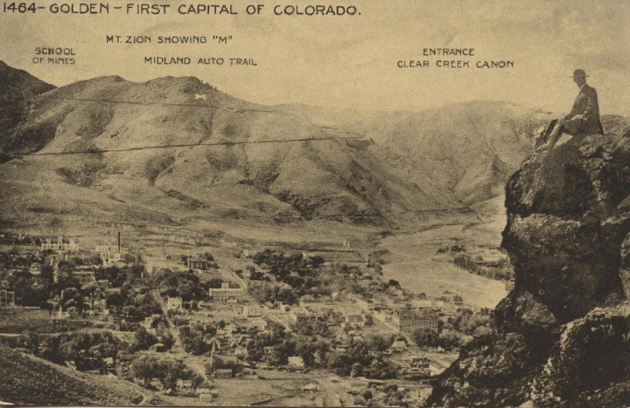 “Taking advantage of the holiday last Friday, School of Mines students placed a mammoth “M” near the summit of Mount Zion. It is constructed of rocks which were whitewashed after being placed, and is 100 by 80 feet. It is easily distinguishable with the naked eye from many points in Denver.”