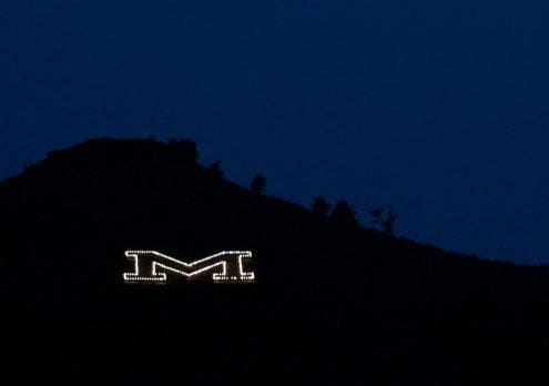 On special occasions, the Blue Key Honor Society, which has charge of the the M, will often change the bulbs to turn the M into another shape (such as a jack-o-lantern on Halloween). At other times, they’ll change the color of the M–often to red at Christmas or on Valentine’s Day.