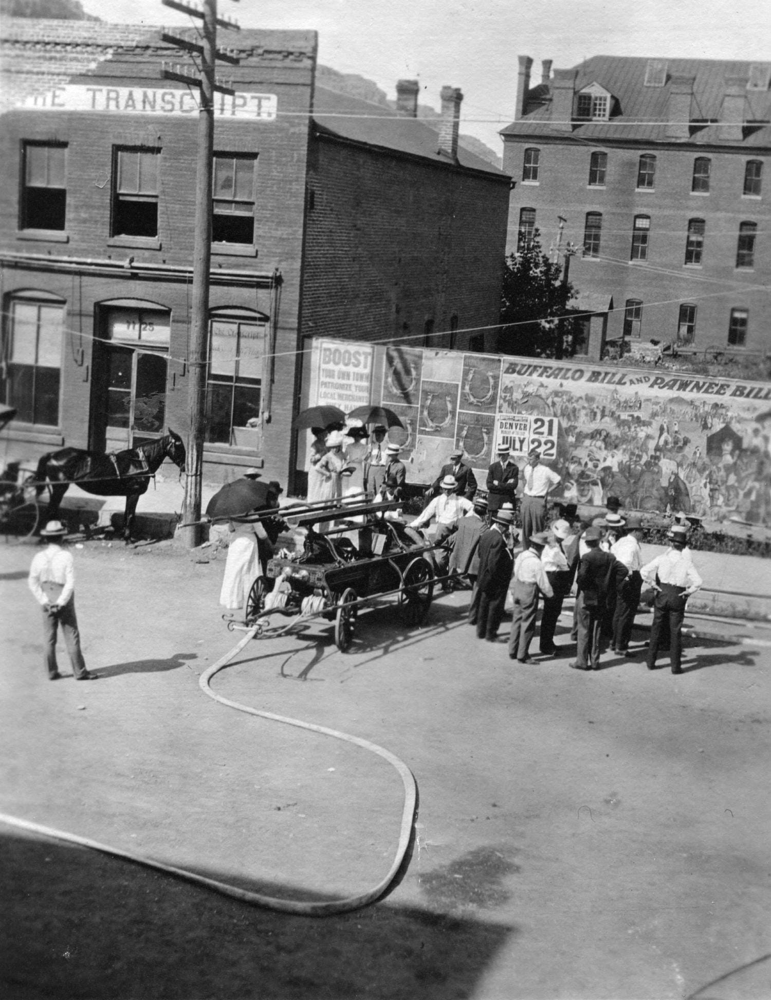 There it is! This photo was taken in 1913. A search of the Colorado Transcript in the weeks prior to July 21-22, 1913 show that there was a tournament of competing fire departments in Golden on the 4th of July. The Denver team brought a piece of antique fire fighting equipment which was much admired all day. So this photo was most likely taken on the 4th of July, 1913.