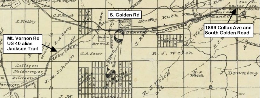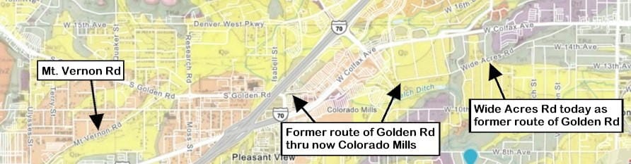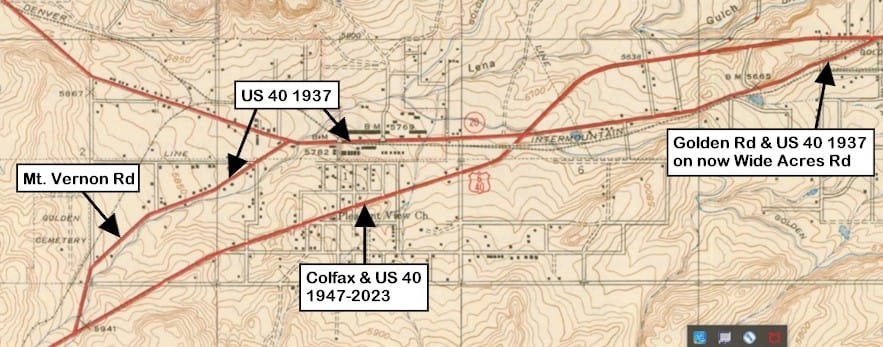 Nonetheless, the main link to Denver remained The Golden Road, which followed a route from Golden straight east through the now Colorado Mills Shopping Center and up now Wide Acres Road to intersect with Colfax. In 1926, Colfax/ Golden Road was designated at US 40, a part of America’s “Victory Highway.” In 1935 – 1936, West Colfax was widened and in 1937 the Works Progress Administration (WPA) rerouted Colfax west to bypass Wide Acres Road and intersect with Golden Road near Camp George West. This improvement was constructed of concrete and gave birth to the nickname “The Concrete Road.” It then followed Golden Road to Mt. Vernon Road (remember the Jackson Trail above), where US 40 turned southwest along Mt. Vernon Road to Heritage Road (Rte 93). And in 1947, Colfax was rerouted yet again and departed Golden Road near Camp George West to run straight along its current alignment. Today, Golden Road now appears to take a sharp turn onto Indiana Ave. But interestingly Golden Road still runs straight east as “Golden Road” as it passes Einstein’s Bagels in Colorado Mills.