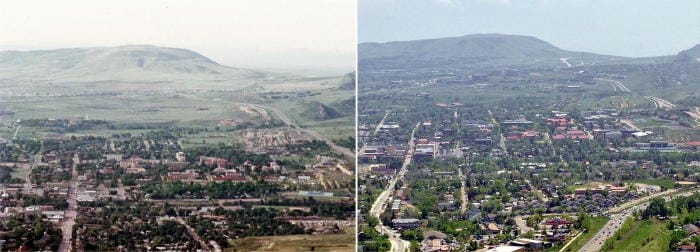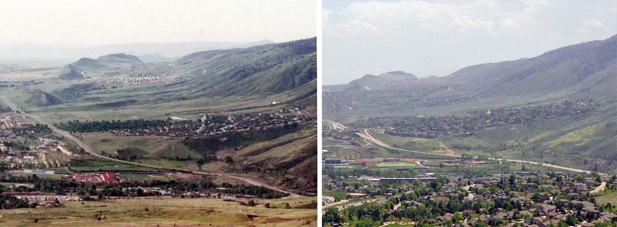 This picture shows area before and after the Canyon Point development. The houses in the foreground are the Mountain Ridge neighborhood. The 1980 photo shows the CSM-Research Institute (red roofs on the south side of the Creek. The 2023 photo shows the Marv Kay stadium in approximately the same place. The Beverly Heights neighborhood (middle-right) has grown closer to Highway 6. In the 1980 photo, the Heritage Dells neighborhood in the distance is under construction. The 2023 photo shows Heritage Dells, Eagle Ridge, and Stonebridge built out with mature trees.