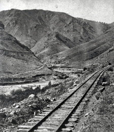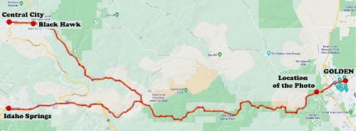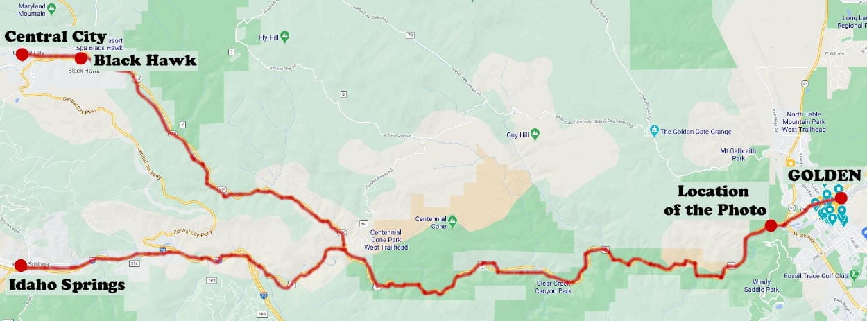 The tracks in the photo belong to the narrow gauge Colorado Central Railroad. From Golden, it followed approximately the same route as Highway 6 to Idaho Springs and Highway 119 to Black Hawk. The railroad tracks were removed in 1941. The plan was to begin construction of the automobile highway immediately, but the project was delayed by our entrance to World War II. The highway was completed in about 1950.