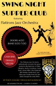 4-7:30PM The Buffalo Rose is having their monthly Swing Night Supper Club tonight. SWING NIGHT SUPPER CLUB: A special evening for fans of BIG BAND and swing dancing. Dinner specials at 4:00, two and a half hours of live BIG BAND jazz from 5:00 to 7:30 by the Flatirons Jazz Orchestra – featuring Deborah Stafford. Dance or just listen to the great Swing Era music of Count Basie, Duke Ellington, Benny Goodman and more. All ages welcome – under 18 with a guardian. The $15 ticket includes both the 3 course dinner AND the music…what a deal! See tonight’s menu….