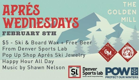 Sponsored by New Belgium Brewing, join us every Wednesday from 5-8 for live music, giveaways, happy hour drink specials, and MORE. Show us your lift ticket or season pass any time on Wednesday and get a FREE Fat Tire Pint. For every pint of Fat Tire that’s sold, The Golden Mill will donate $1 to Protect Our Winters. On February 8th from 5-8 PM we will be having music from Shawn Nelson, a pop up shop from Aprés Ski Jewelry and Ski Waxes from Denver Sports Lab