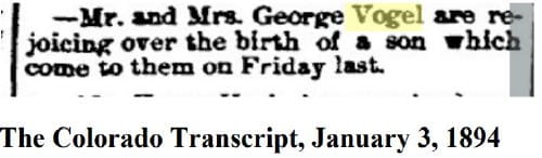 Vogel eventually sold his feed store in Golden and became a Coors distributor in Central City. He and Christina had several more children, all duly announced in the Transcript. He made periodic business trips to Golden, where, according to the Transcript, his friends were always glad to see him.