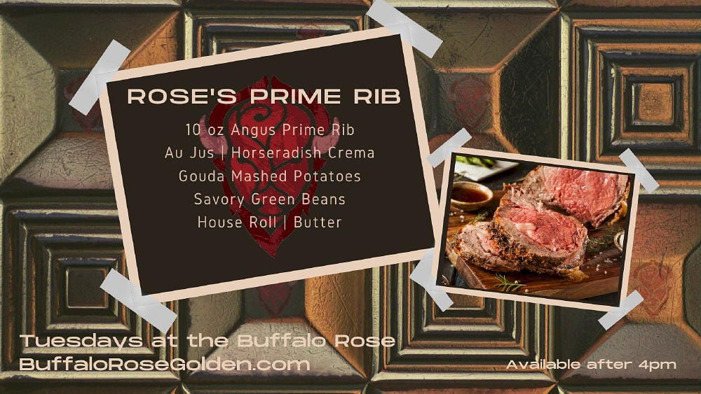 4-10PM The Buffalo Rose has started offering a prime rib special on Tuesday nights. For $25, you get a 10 oz prime rib with gouda mashed potatoes, green beans, and a roll. The special is available until they run out!