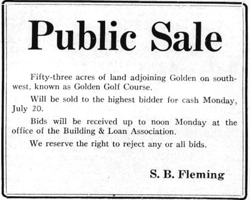 Fossil Trace was not Golden’s first golf course. In 1930, a local group of golf enthusiasts decided to form a club, purchase land in or near Golden, and have a 9-hole golf course built. The membership would be limited to 100. Each member was to contribute a $25 initiation fee with annual dues to be determined later. Fifty men immediately indicated interest in joining.