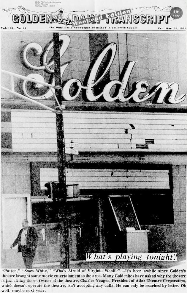 The March 26, 1971 Golden Daily Transcript expressed frustration with our downtown movie theater. The theater had been open for a few weeks in January, showing the movie Airplane. Posters at that time indicated that Patton would be coming soon, but the theater remained closed, and the owner was unreachable.