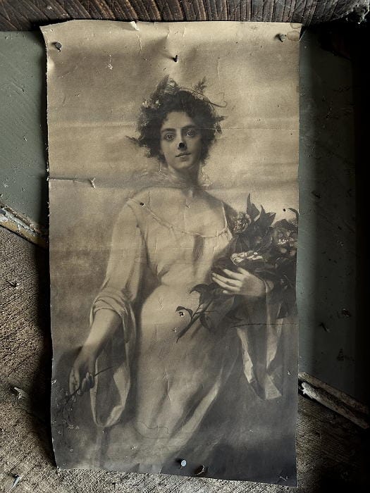 In removing the walls in the third floor attic, the crew was startled to find a woman staring out at them. Who was she? Was it a wedding photo, a pin-up girl, an art print?
