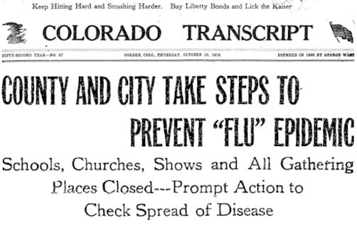 The October 10, 1918 Colorado Transcript announced that the City and County were imposing new rules to prevent the spread of the world-wide influenza epidemic. Effective immediately, all schools and churches were to be closed. Parties, dances, and lodge meetings were forbidden, and pool rooms, card rooms, and cigar stores were closed.