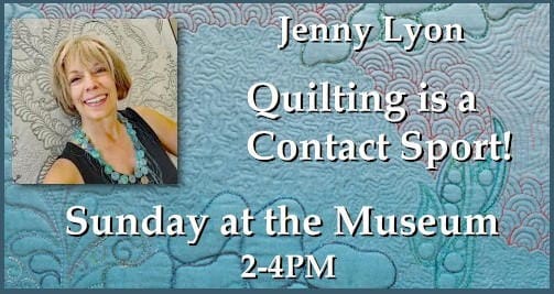 Join us on Sunday, October 10, 2021, when Jenny Lyon presents via Zoom her talk: Quilting is a Contact Sport! Jenny quilts and creates from her home studio in northern California and travels the country to teach and lecture on free-motion quilting. She loves to inspire and instruct her students to quilt their own quilts their own way. She calls herself “The Quiltskipper” because the joy of creating quilts sometimes just has to be expressed in a quick and silly skip around the house! Zoom link: Sunday at the Museum October 10, 2021 Meeting ID: 859 0950 8528 Passcode: 598016