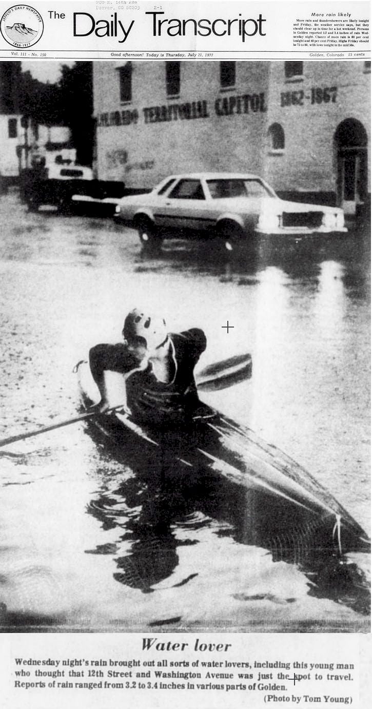 The July 21, 1977 Golden Transcript featured this photo of a kayaker on 12th Street. Admittedly, the car a few feet north was not in flood conditions, but our storm sewers were clearly overwhelmed on the south side of the street! The building in the background is the Loveland Block, aka the Old Capitol Grill restaurant.