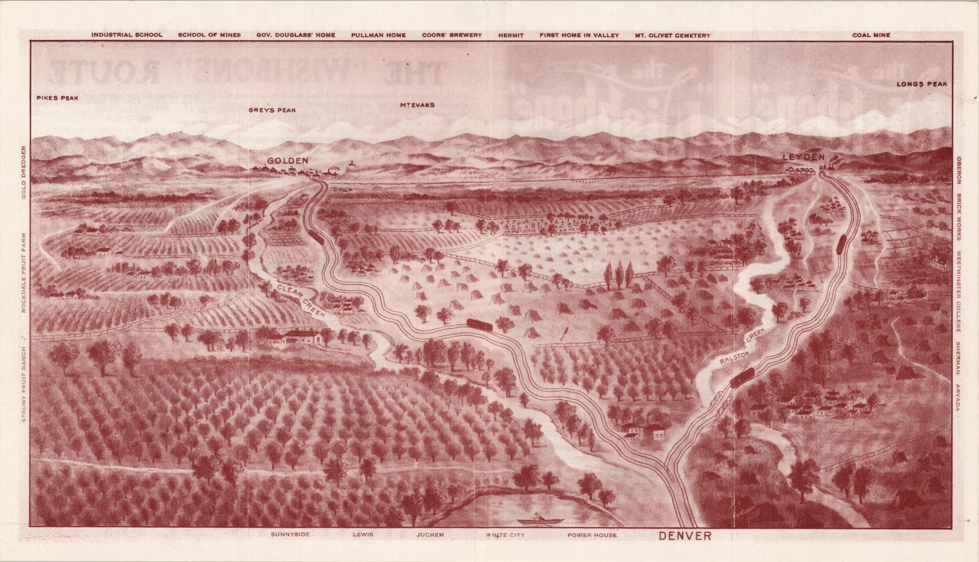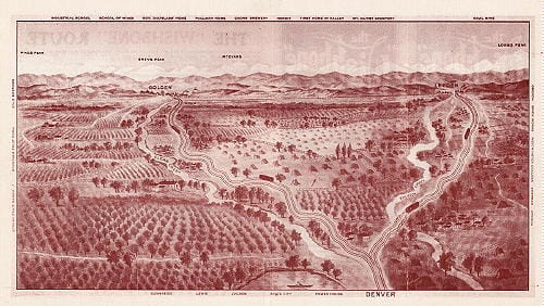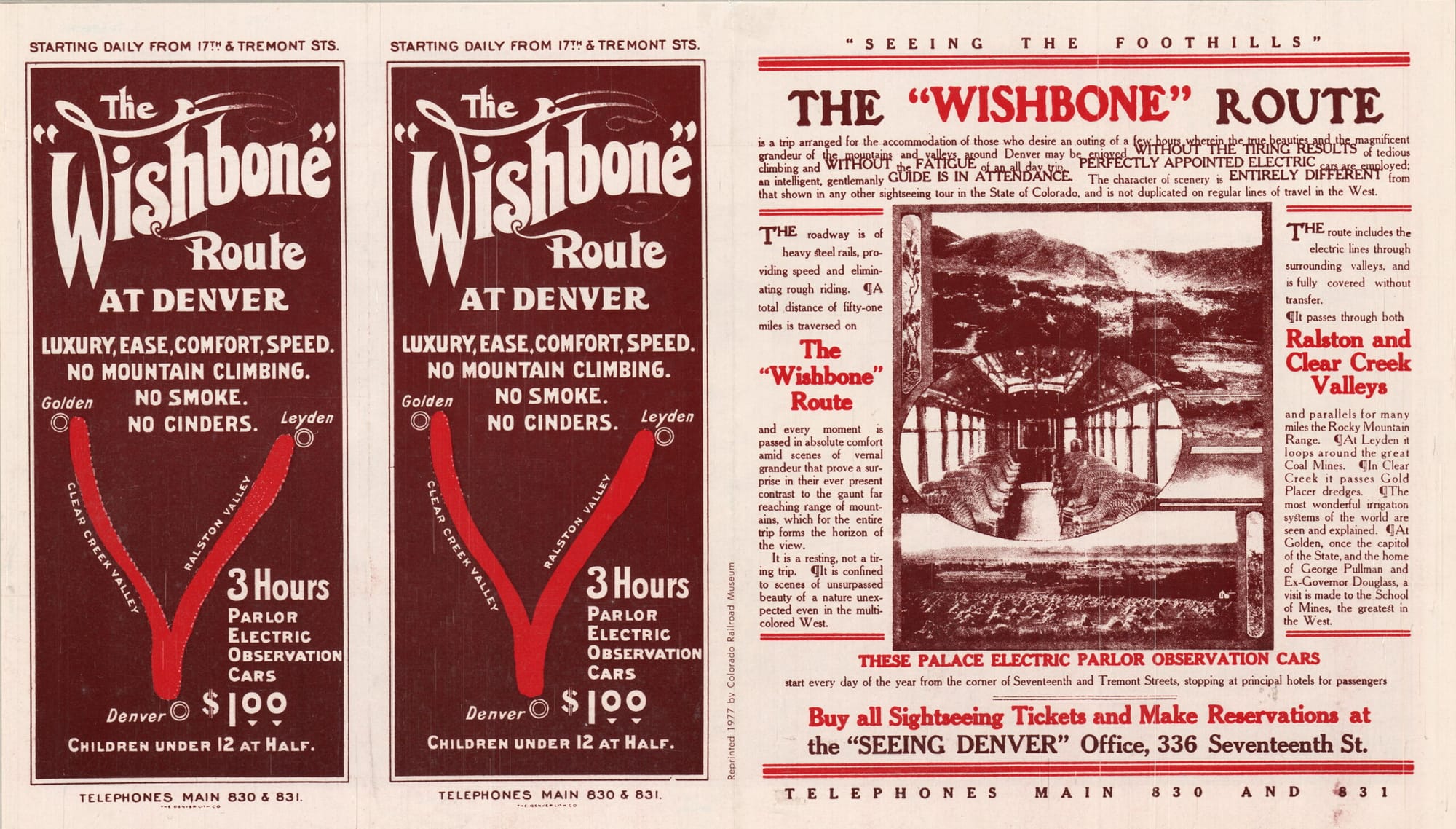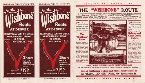 One of their offerings was called the “Wishbone” Route. That would go from Denver to the coal-mining town of Leyden (map), giving passengers a view of the Ralston Creek valley. The car would then backtrack to Arvada and follow the Clear Creek valley into Golden.