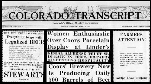 Based on the April 20, 1933 Colorado Transcript, the mood in town was decidedly upbeat. The town was still celebrating the repeal of Prohibition and the reopening of Coors Brewery. Production was up to 500 barrels a day, and the pent-up demand was apparently endless. Adolph Coors Jr. told the Transcript that he considered legalized beer as a relief measure and felt he had a responsibility to reinvest all profits in creating jobs
