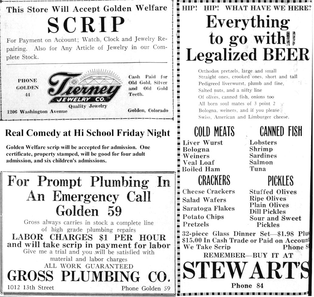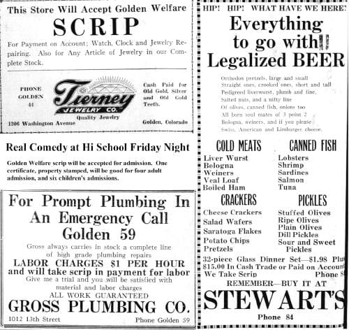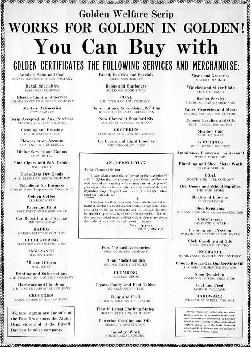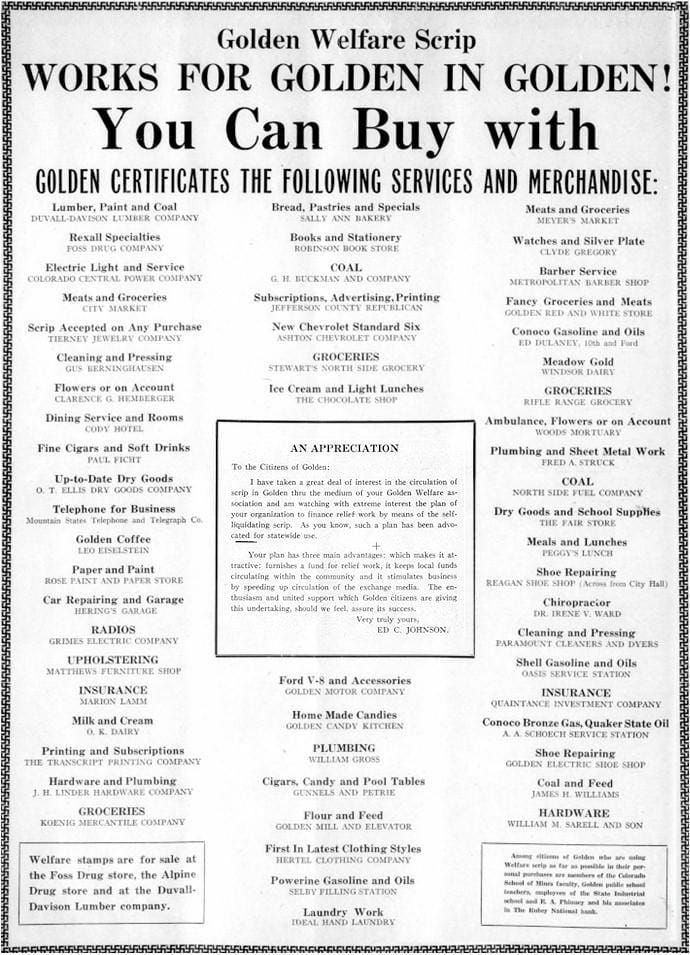 The street supervisor was paid for road work with Golden Welfare Scrip. He used it at Golden’s Red & White for groceries. The grocery store took it to the Colorado Central Power Company and applied it to their electricity bill. The Power Company used it at the Transcript to pay for advertising. The Transcript use it to pay one of their reporters. He took it to Stewart’s and bought some groceries. Stewart took it to the lumber yard to pay for coal. The lumber yard used it at Koenig Mercantile for groceries. Koenig used it at the Golden Mill to buy flour. The Mill used it to buy gas. The gas station owner applied it to his account at Hertel’s clothing store. Hertel used it at the City Market for groceries. The City Market took it to the Power Company to apply to their electricity bill…. And so on, and so on.