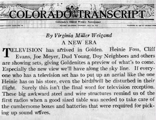 The July 24, 1952 Colorado Transcript announced “A NEW ERA: Television has arrived in Golden.” The signals went live on July 21, 1952. Several Golden-area businesses bought television sets, so they could show their customers what to expect. During the first few days of broadcasting, while owners tried to figure out TV antennas, the most popular show was static.