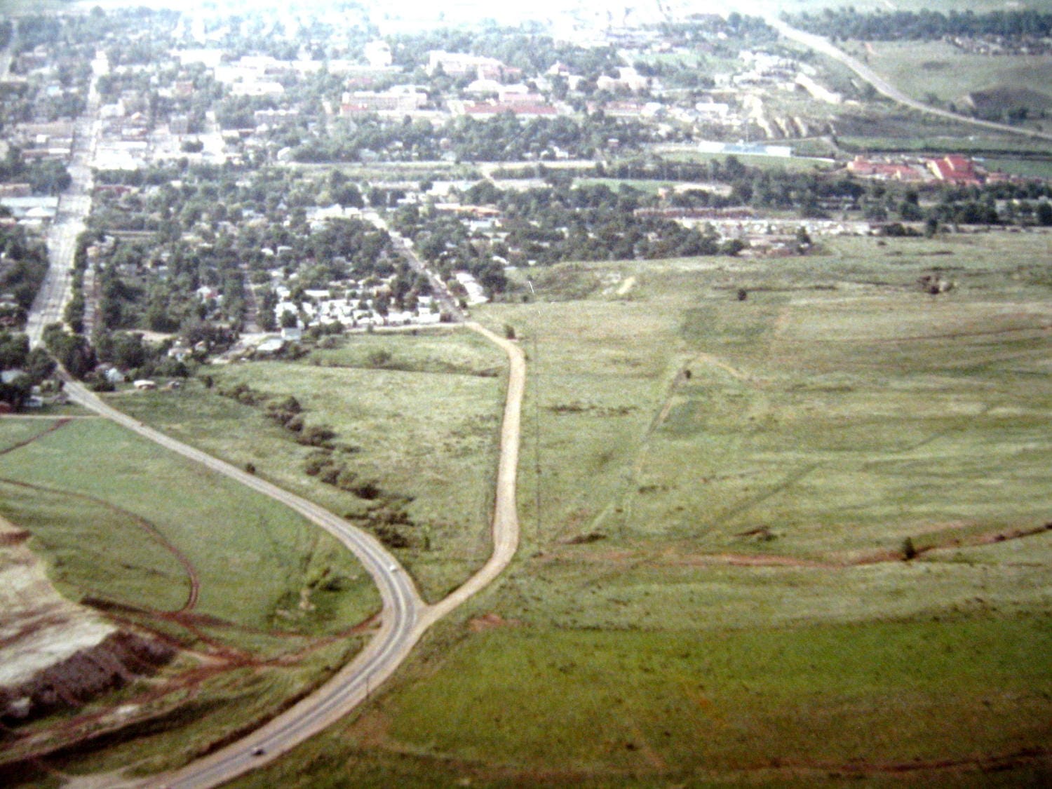 Bill Robie sent me the photo above, which he took in ’82 or ’83 of the future site of the Canyon Point/Mountain Ridge development. The paved road on the left is Washington Avenue (on its old alignment). The unpaved road in the middle is Cheyenne. To the right (west) of Cheyenne, you can see the faint remnants of the runway for the airfield that never quite happened. Bill says that the south end of the runway would have been about where Mitchell Elementary’s parking lot is now.