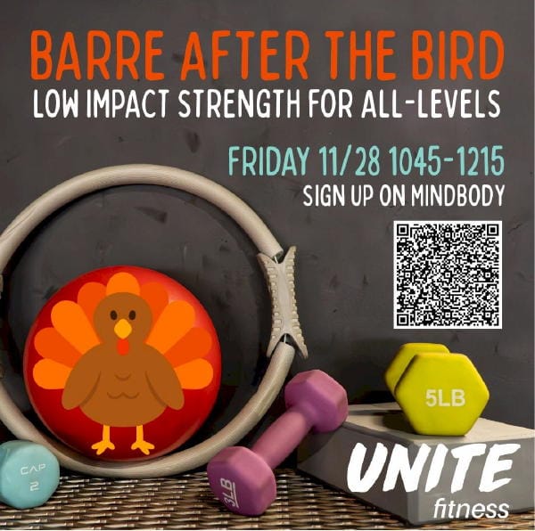 Enjoy a special ‘Barre After the Bird’ all-levels Low-Impact class with Unite Coach and Golden Mayor Laura Weinberg on Friday 28 Nov 10:45-12:15 at Unite Fitness.