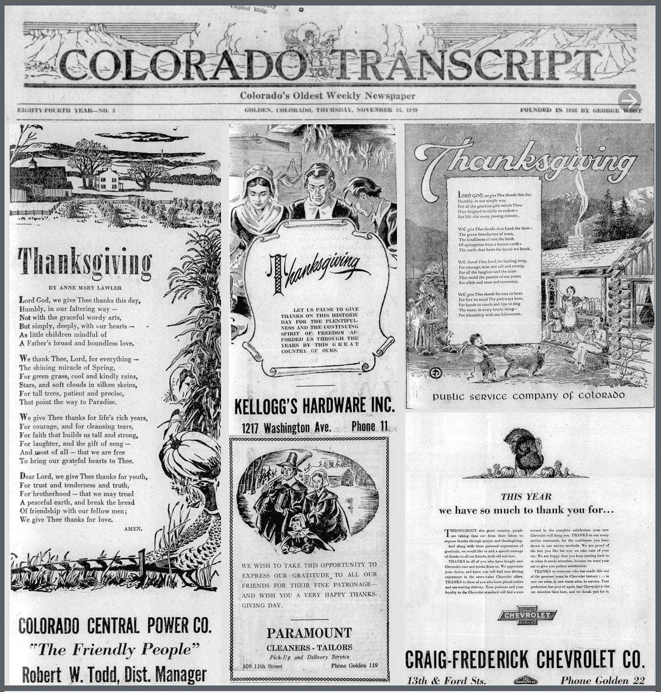 The November 24, 1949 Colorado Transcript included a Thanksgiving Proclamation by Governor Lee Knous. It also included an editorial, reminding us to be grateful not only for our Thanksgiving feast but for our homes, our senses, and our clothes. They followed this with a reminder to Shop Early For Christmas.