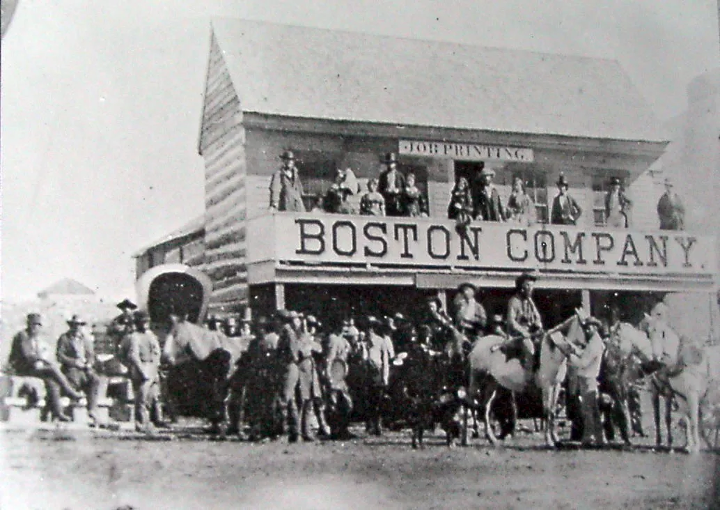 This photo shows some of Golden’s earliest settlers. The men of the Boston Company arrived in Golden in June of 1859. They came with wagonloads of goods to sell and built one of our first store buildings on the north side of the Creek, in what is now Parfet Park. Look around the park the next time you’re there and see if you can spot the marker that commemorates the site of this building.