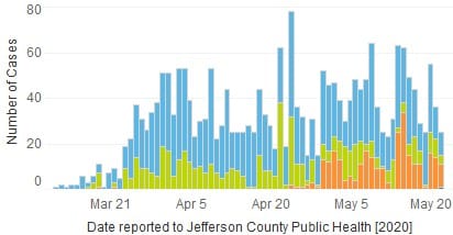 Jefferson County’s case count page says that as of 3PM yesterday, there have been 2,273 cases in Jefferson County (up from 2,237). There have been 141 deaths (up from 136) and 338 are hospitalized (up from 337). There are 191 known cases in Golden (up from 187).