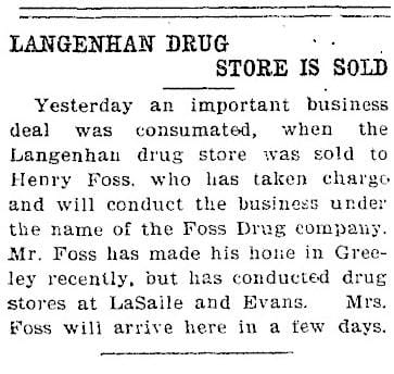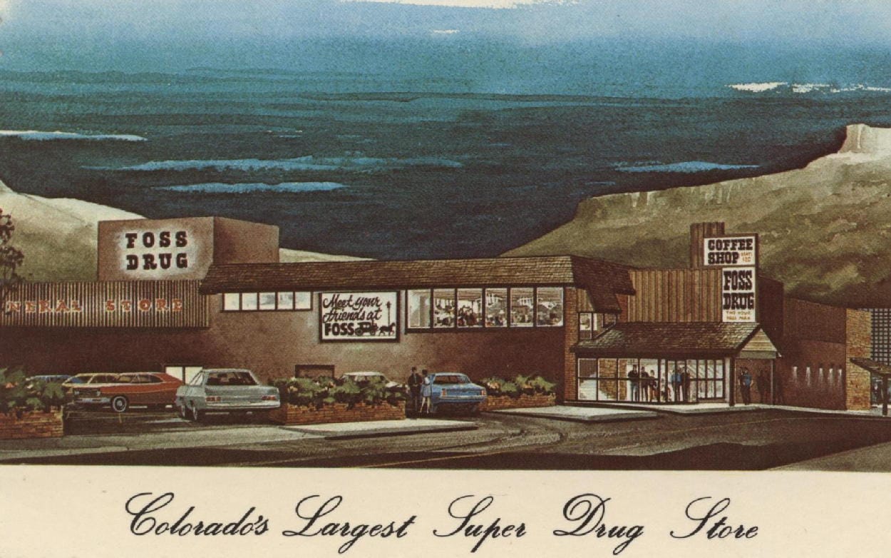 The January 31, 1963 Colorado Transcript reported that Foss Drug Store was beginning a year-long celebration of the store’s golden anniversary. The paper told of Henry Foss, Sr. purchasing the store in 1913. In the early days, the store grossed $100 on a good day. Many expansions and service improvements took place over the years and by 1963, the store was grossing $1.5 million/year.