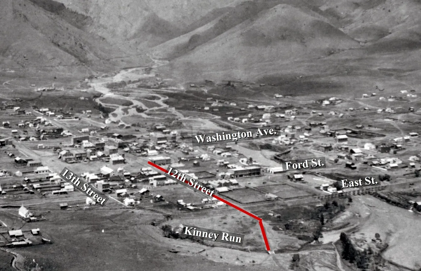 Kinney Run winds through the south side of Golden, starting in the foothills and eventually joining Clear Creek near Ford Street. It serves as the drainage for much of south Golden, collecting run-off when it rains. The confluence, where the Run meets the Creek, used to slope rather steeply down to the Creek. The area would have accumulated soil from runoff, and like any good delta, was probably a rich, fertile patch of land. It was also a fun place for kids to play.