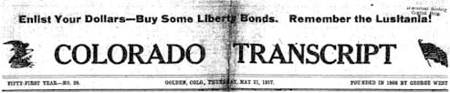 The May 31, 1917 Colorado Transcript captured Golden at a turning point. The members of the pioneer era were fast dying out, and the 20th century was coming on with a vengeance: on April 6 of that year, President Wilson had asked Congress to commit America to “a war to end all wars” (World War I).
