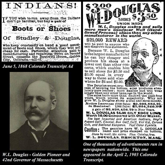 I didn’t know, so I decided to research the man. Douglas did indeed make and sell shoes in Golden Colorado. According to a November 17, 1904 Transcript article, Douglas sold his business and possessions in 1868 or 1869 and left Golden with $470. From here, he went to Massachusetts and started a shoe factory. The business did well and Douglas became a wealthy man. In addition to large-scale production, he owned a chain of shoe stores across the nation.