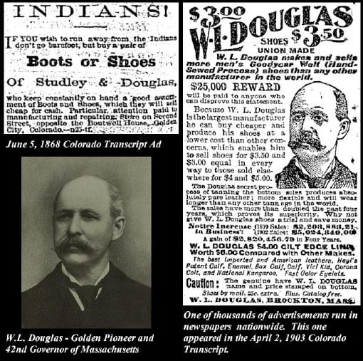 The Transcript liked to point out that much of Douglas’s success came from advertising in newspapers. Douglas advertised in papers all over the county, including the Colorado Transcript, but the Transcript had the honor of printing Douglas’s very first advertisement, in the June 5, 1867 edition. The Plains Indian War was heating up at that time, and he suggested that a pair of his shoes would help you run away from Indians.