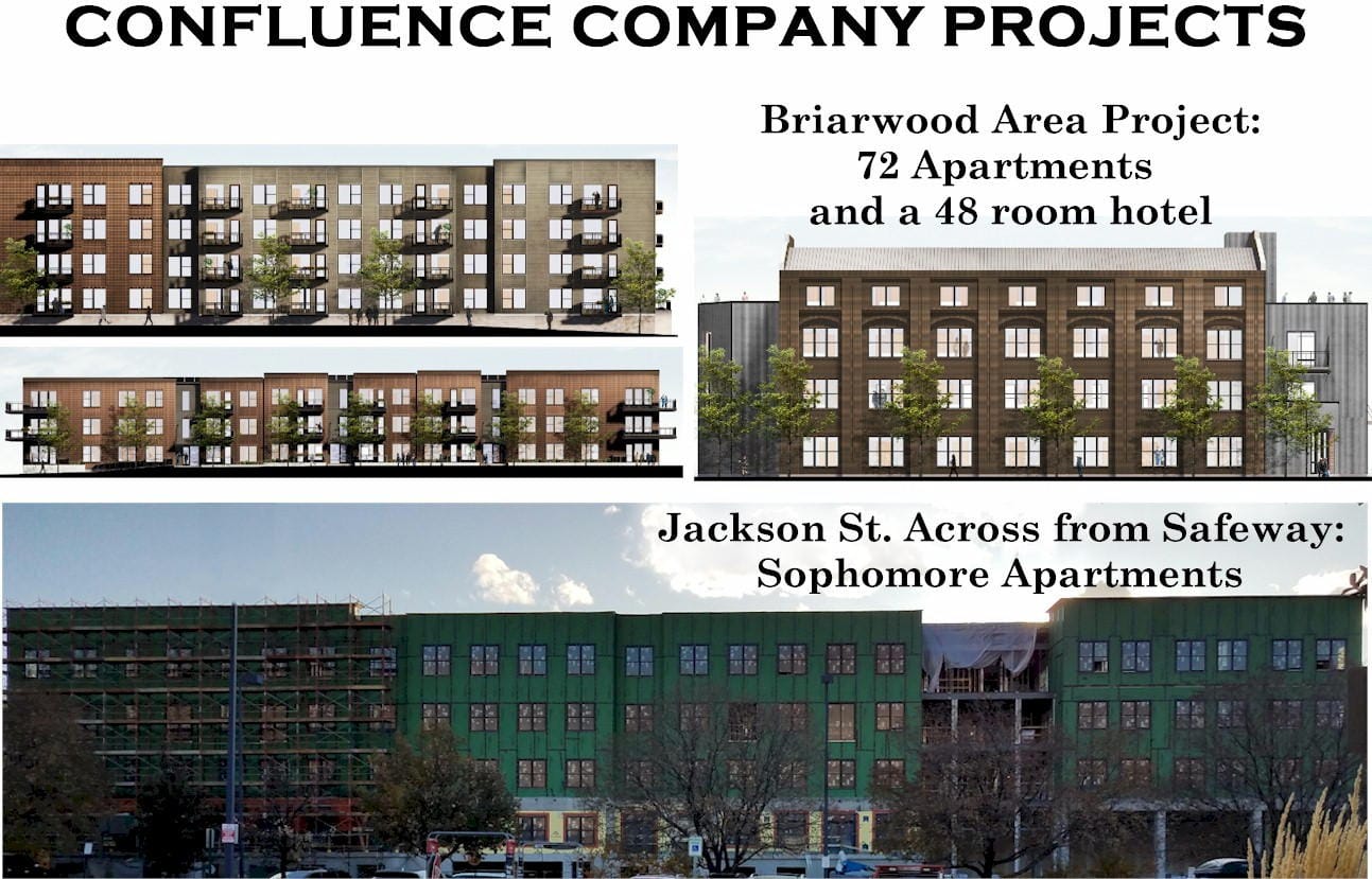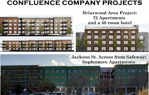 The second case is considerably more unusual and complex. Confluence has developed many projects around town, including the West 8th Apartments (map), 8th Street Residences (map), and Arapahoe Row (map). They are currently building the 72 apartment/48 hotel room complex on the Briarwood property at the west end of 8th Street and the new sophomore apartment building on Jackson Street, across from Safeway.