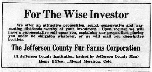 The economics of the business were also desirable. As one “rancher” explained in 1926, “One beauty about the fox industry for Colorado…is that it is not necessary to utilize valuable land that is suitable for agriculture or other purposes. There are hundreds of ranches in Colorado that could well afford to appropriate a small portion of worthless land for the raising of silver foxes, and I know it to be a fact that from this land that ordinarily would never produce a penny, they would realize more of an acre than they do now from the most fertile portions, if they would raise silver foxes on it.”