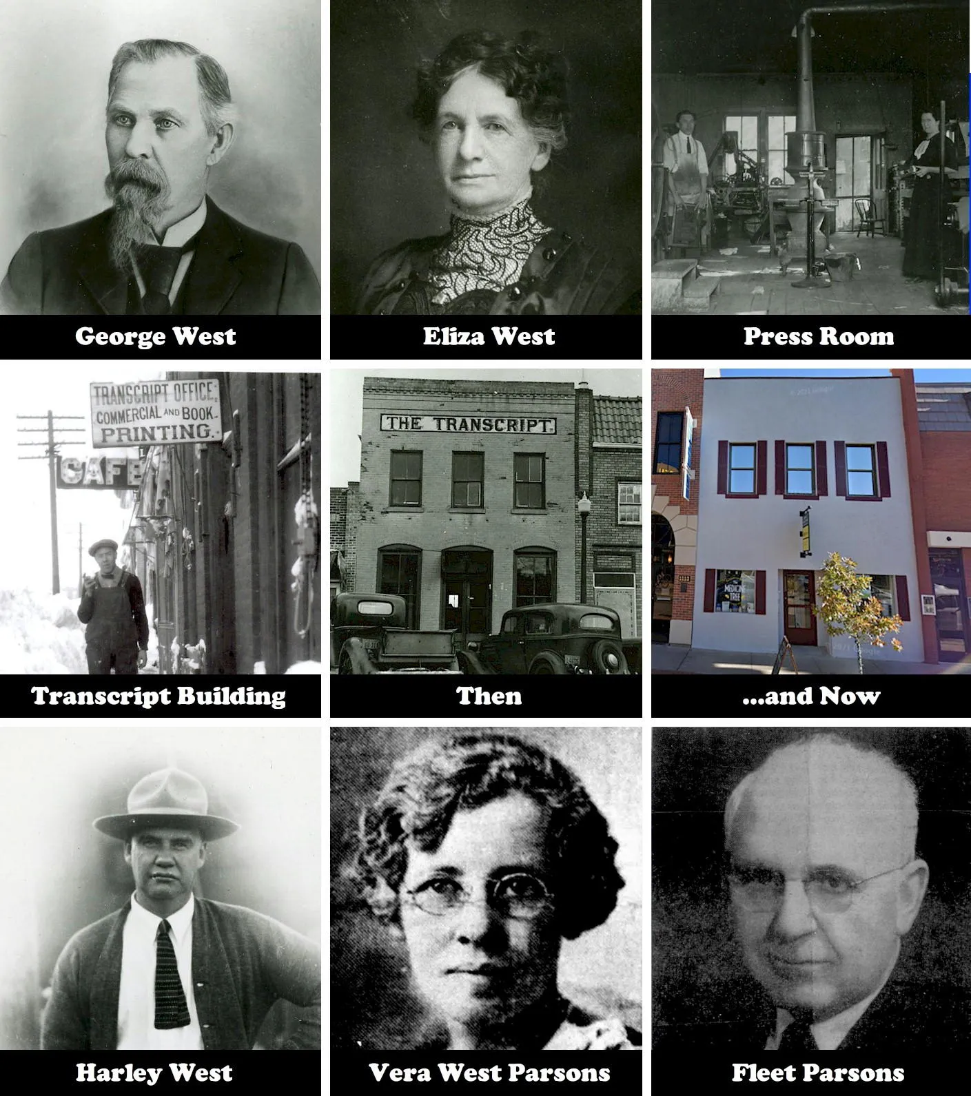 George West ran the Transcript from its founding in 1866 until his death in 1906. When he died, his wife Eliza became the President of the company and his son Harley became the editor. When Harley died in 1927, his wife Vera became the President. She later installed her second husband—Fleet Parsons—as editor, while she retained ownership until her own death in 1954. Fleet continued to run the paper until his death in 1959.