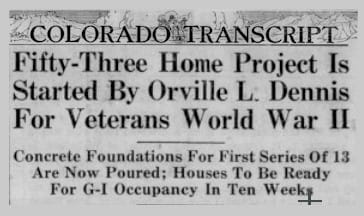 Orville Dennis also built many homes in Golden for the veterans market. He began in 1949, with the first batch being on 2nd Street between Washington and Ford. The homes were 24×24 feet, with two bedrooms and one bath. They sold for $6700. In 1950, Dennis built an additional twelve houses on North Ford near the Foss Ranch. Those homes sold for $8500. He then moved on to Goldco Circle (the former Cemetery Hill), with those houses ranging from $7000 to $8500.