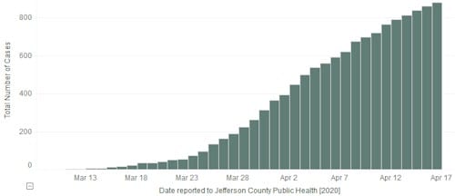Jefferson County’s case count page says that as of 3PM yesterday, there were 881 (up from 851) cases in Jefferson County. There have been 33 deaths (up from 32) and 218 are hospitalized (up from 213). There are 80 known cases in Golden (up from 79).