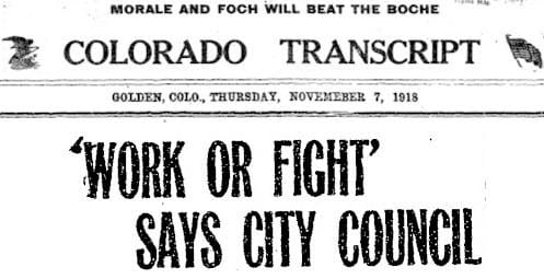 The November 7, 1918 Colorado Transcript announced City Council’s latest ordinance. At the request of the War Department, effective immediately, the City of Golden required “all able-bodied men between the ages of 16 and 61 to engage regularly and habitually in some useful and recognized business, trade, or occupation for at least five days of each calendar week and an average of at least six hours per day…. This legislation by the city council is purely a war measure, and while it may seem drastic, similar orders have been passed by almost every municipality in the country.”