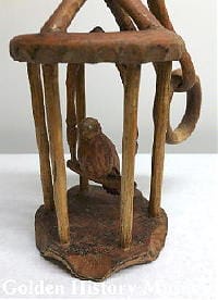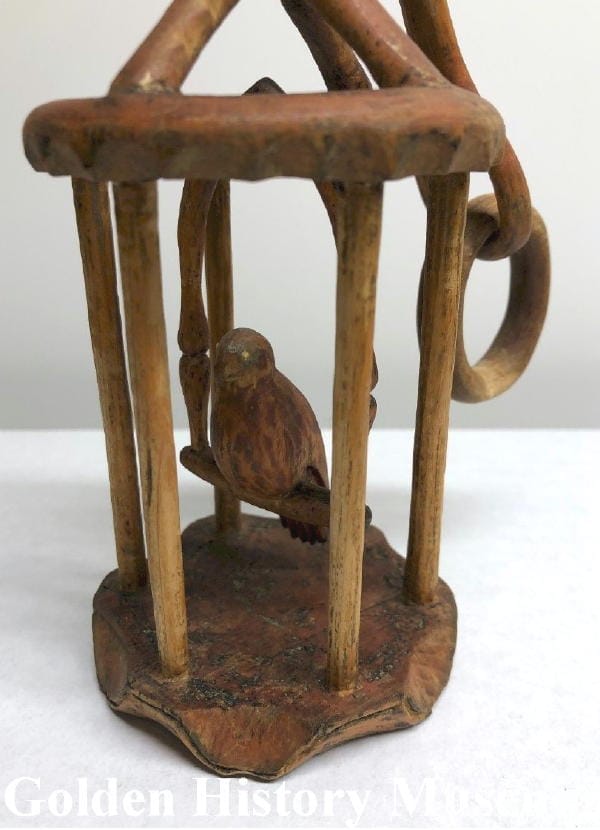 Neil picked up the package, shook it, removed the string and wrapping paper, and read the inscription on the box. It was a donation to the newly-forming Jefferson County museum. The package contained a carved parrot in a cage. The card accompanying the donation explained that the bird-in-cage was all carved from a single piece of wood, which was once part of the bridge over Kinney Run at 17th Street. Two men had been hanged from that bridge after murdering Reuben Hayward in 1879.