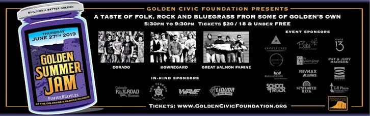 The Golden Civic Foundation is proud to announce that the 3rd Annual Golden Summer Jam will be held on Thursday, June 27th at the Colorado Railroad Museum from 5:30 – 9:30 p.m. and features live music, food and fun for all ages. The goal of this summertime event is to connect with Golden families and residents, promote community involvement and celebrate Golden’s small town, friendly atmosphere.