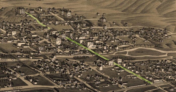 The railroad crossed Washington Avenue at 8th Street and the courthouse topped the hill at 15th and Washington, so the author was envisioning seven blocks of trees. He suggested that the city install a ditch running down from the courthouse to keep the trees watered.