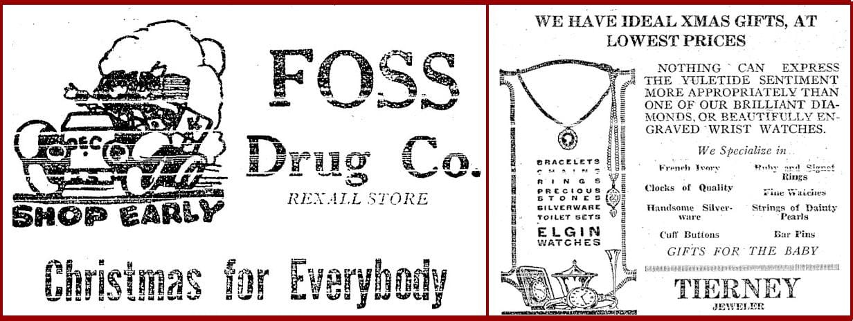 Foss Drug suggested perfume, ivory brushes, and ma jong sets for her, Kodaks, cuff links, and radio sets for Him, and balls and dolls “for the Kiddies.” Tierney Jeweler promised that “Nothing can express the yuletide sentiment more appropriately than one of our brilliant diamonds or beautifully engraved wrist watches.”