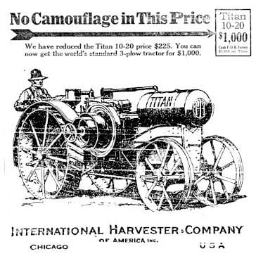 International Harvester was still using some war parlance in their advertising, assuring farmers that there was no camouflage in their pricing.
